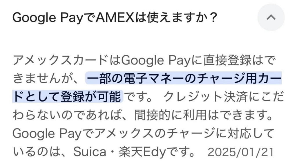 他のVISAやMastercardは問題なく登録できましたが、AmexはApple Payしか対応しておらず、これが予想外の落とし穴でした。結局、Amexの支払いをしたいときは物理的なカードを財布から取り出すか、他のスマホ決済アプリを利用するしかなく、iPhoneでは当たり前だった「スマホひとつで完結するスマートな決済」が一部崩れてしまいました。